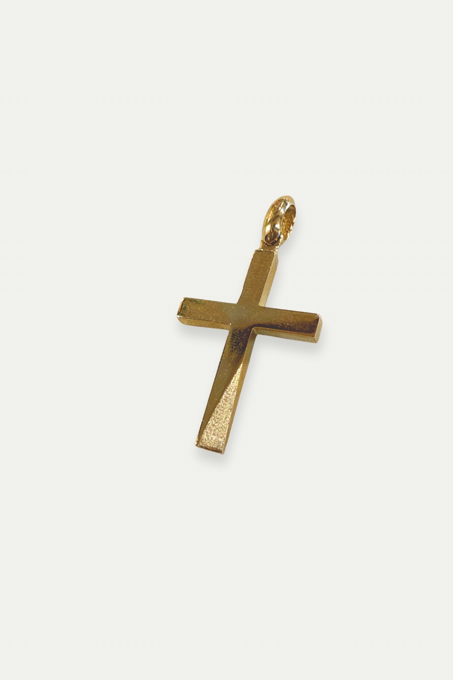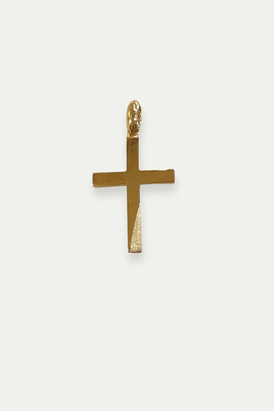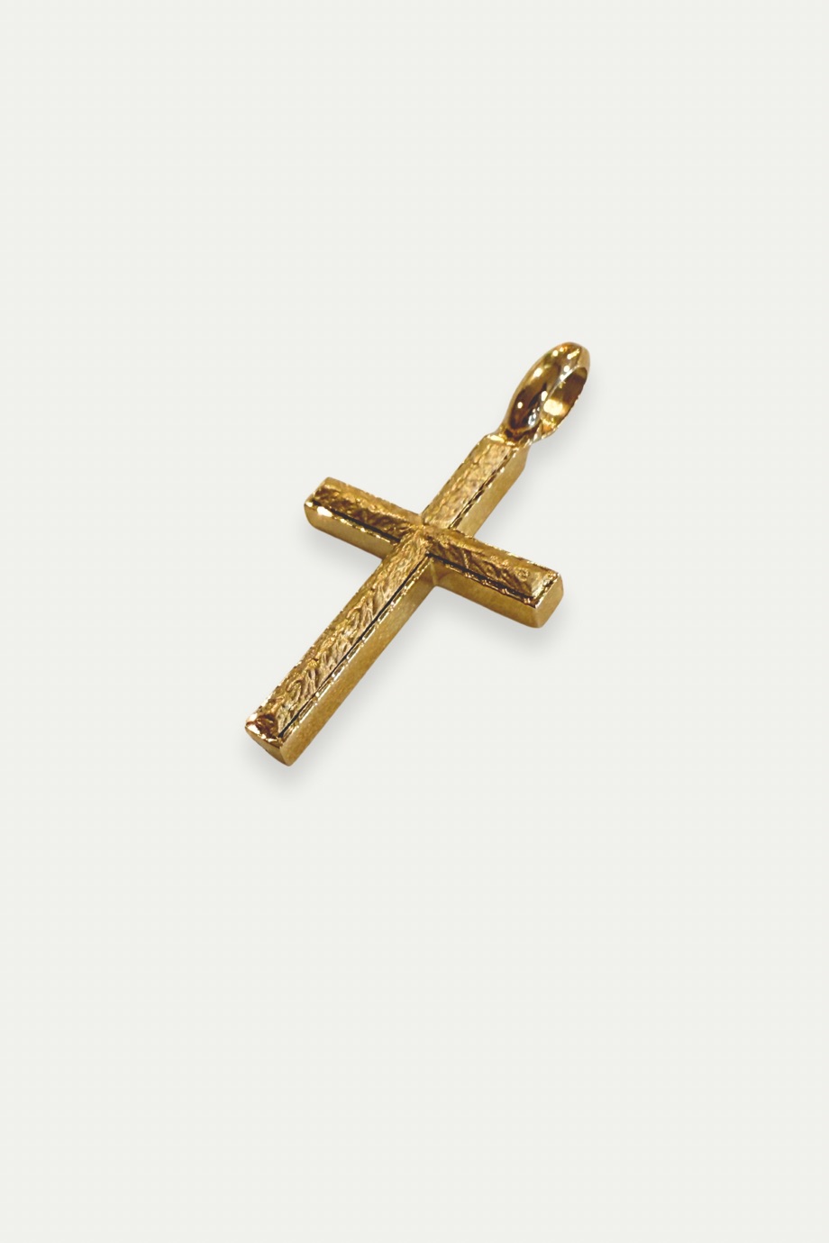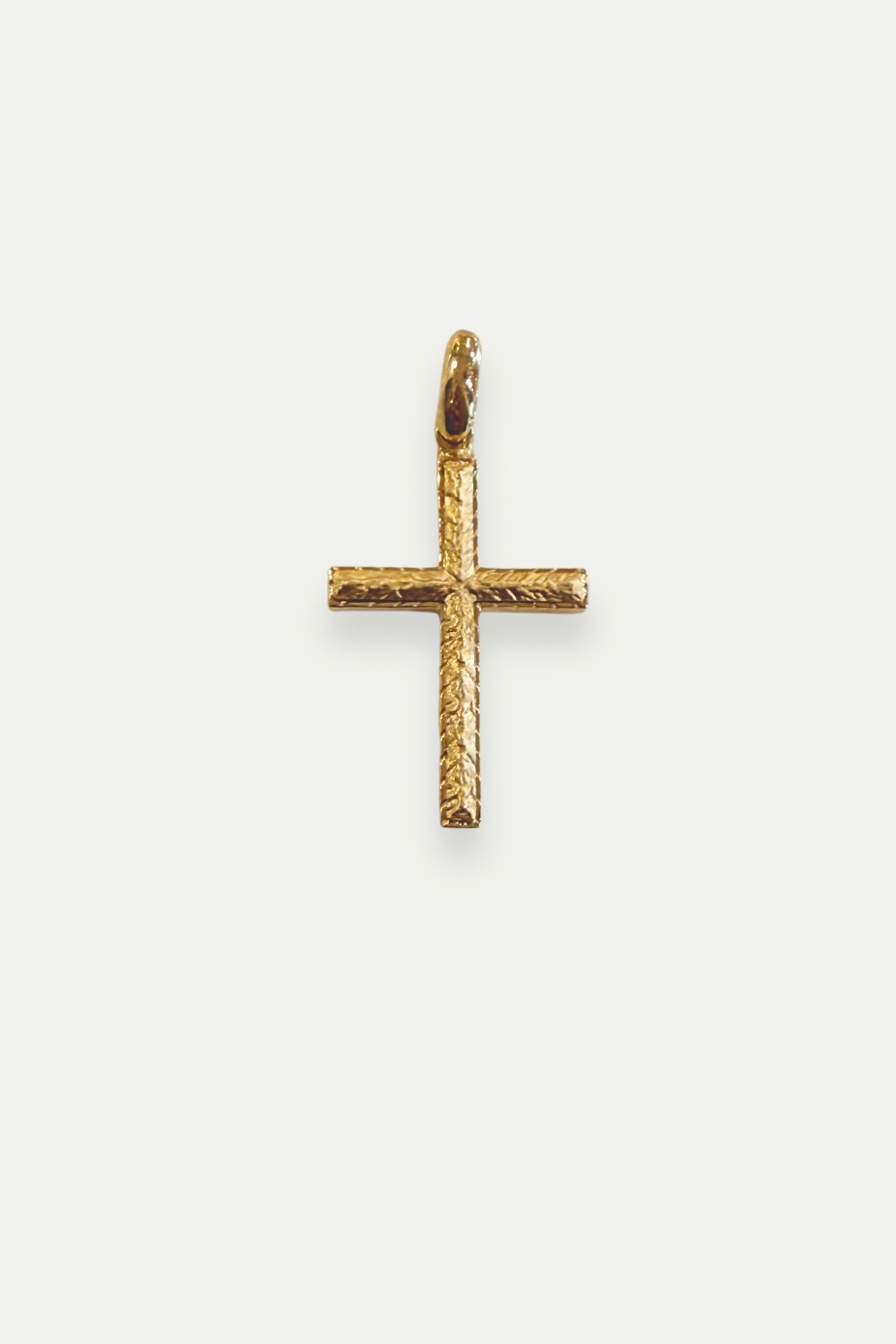 A classic 14K gold cross pendant with refined engraved details along the surface, offering a timeless expression of faith and elegance. Its clean lines and subtle texture make it a beautiful piece for both everyday wear and special occasions.