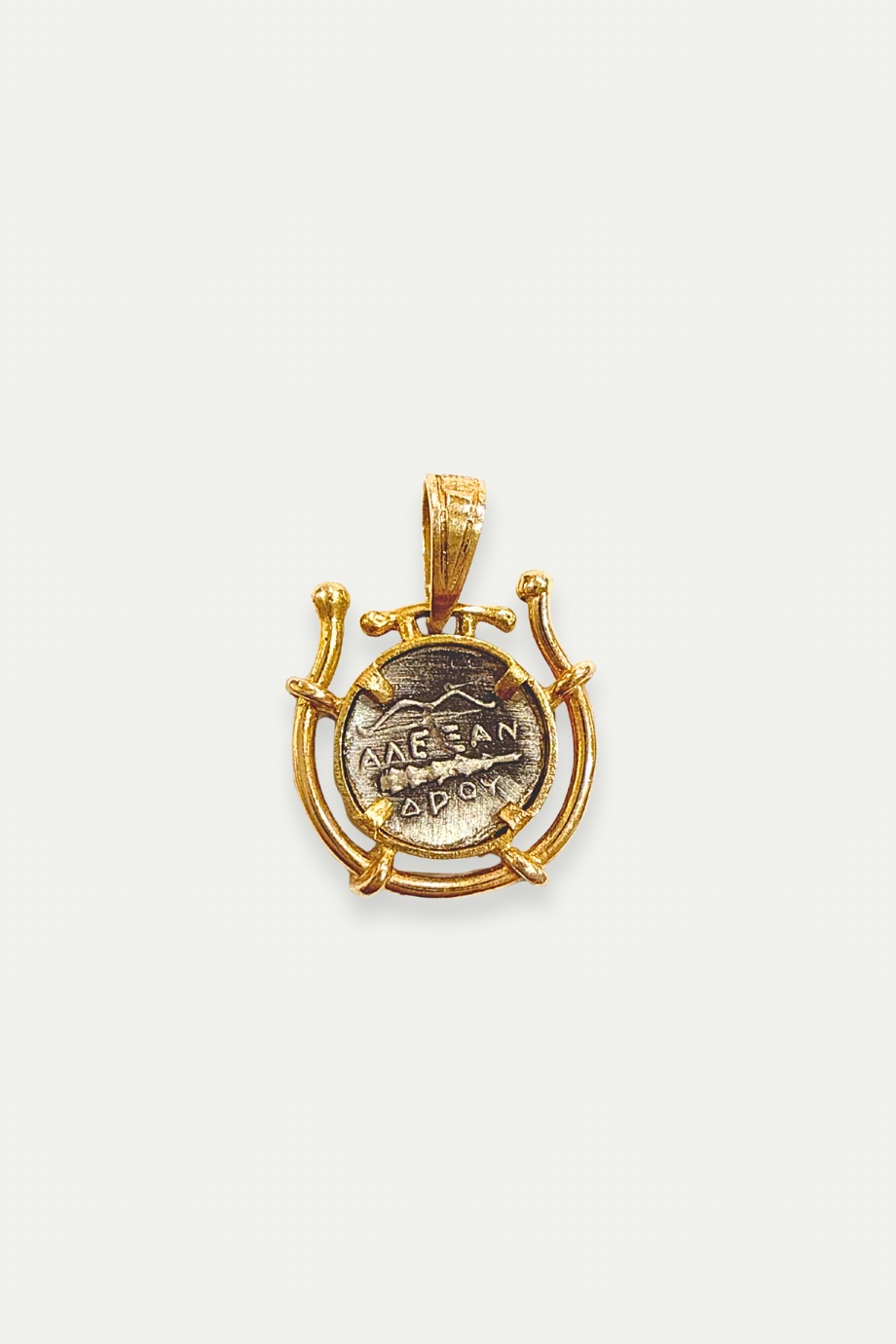 This striking pendant features a two-sided replica of an ancient Greek coin, showcasing the legendary Alexander the Great. On one side, the profile of Alexander is boldly depicted, while the reverse bears the iconic inscription “ΑΛΕΞΑΝΔΡΟΥ” in ancient Greek script.