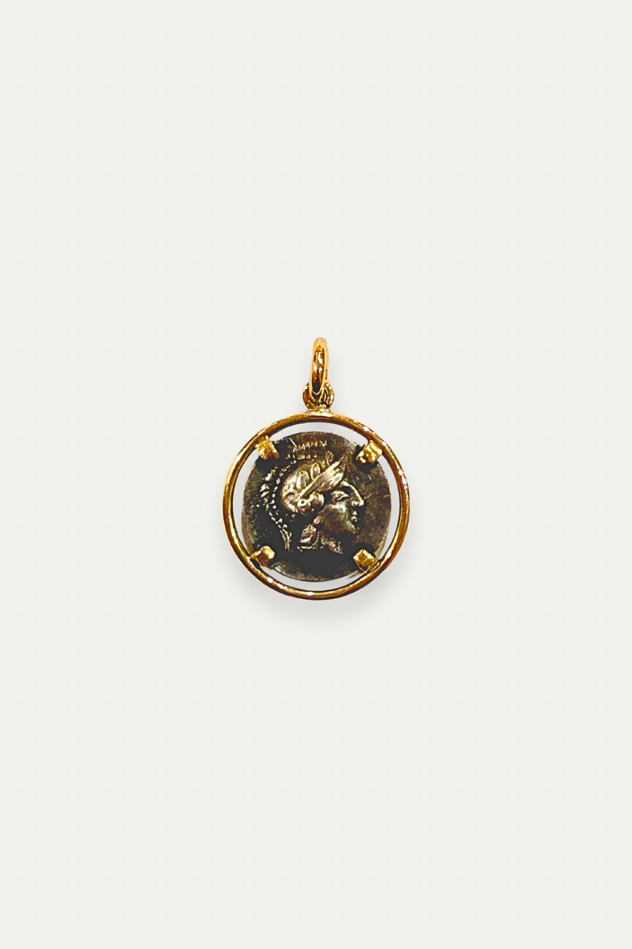 Celebrate the wisdom and strength of Ancient Greece with this stunning two-sided coin pendant featuring Athena and her sacred owl. Handcrafted with a mix of solid 14K gold and oxidized sterling silver, this timeless piece pays tribute to classical Greek artistry and symbolism.