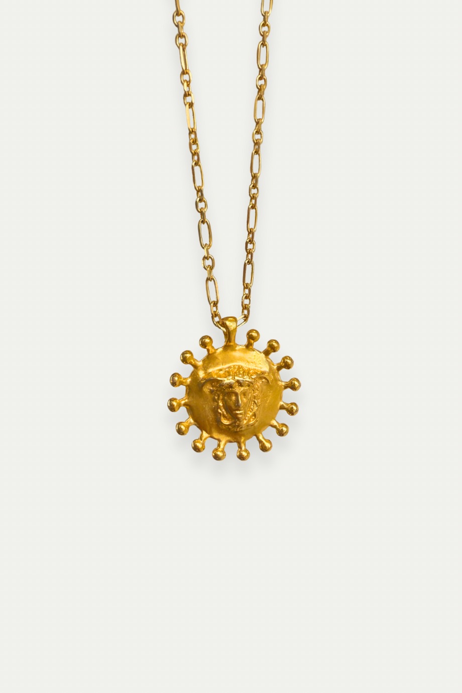 The handmade pendant features a striking embossed Medusa head — a powerful emblem of protection and transformation in ancient mythology — encircled by a sun-like border of rounded spikes, giving it a modern edge.